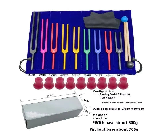 This 9-piece Solfeggio tuning fork set is crafted from durable aluminum alloy, featuring a vibrant array of colors. Perfect for sound therapy, fitness, massage, or as a musical instrument accessory. The set includes all forks with or without a color base for versatility. Ideal for health, home, or studio use.